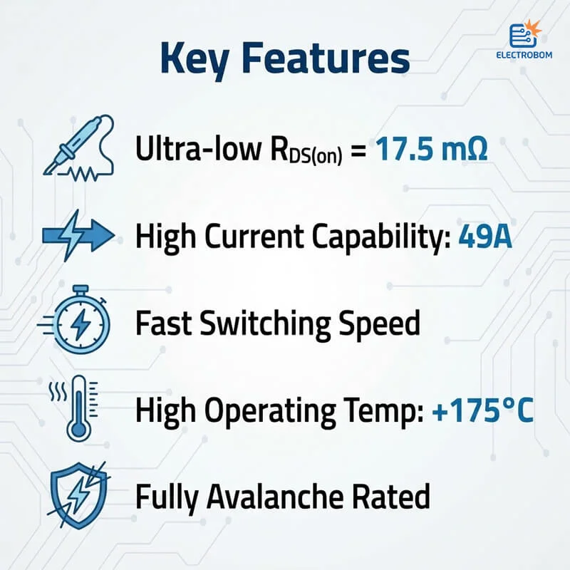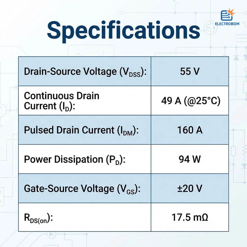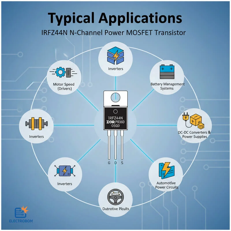 بفضل الأداء العالي والموثوقية الممتازة، يُعد IRFZ44N MOSFET خيارًا مثاليًا لفنيي الإلكترونيات والهواة الذين يبحثون عن عنصر قوي ومستقر في تطبيقات التحكم بالطاقة والتبديل السريع.
