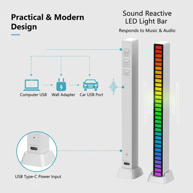 أضف نبضاً بصرياً لموسيقاك وألعابك! بار الإضاءة الذكي المتناغم (RGB Rhythm Light Bar) هو القطعة الفنية التي تنقص الـ (Setup) الخاص بك. بفضل الميكروفون المدمج عالي الحساسية، يلتقط هذا البار الأصوات المحيطة والإيقاعات بدقة متناهية ليحولها إلى عرض ضوئي مذهل يتراقص مع الموسيقى. تصميمه الأنيق باللون الأبيض يجعله تحفة فنية على مكتبك، سواء كنت "جيمر" محترف، أو صانع محتوى، أو ببساطة من عشاق الاستماع للموسيقى في سيارتك وتريد إضافة جو من الرفاهية.