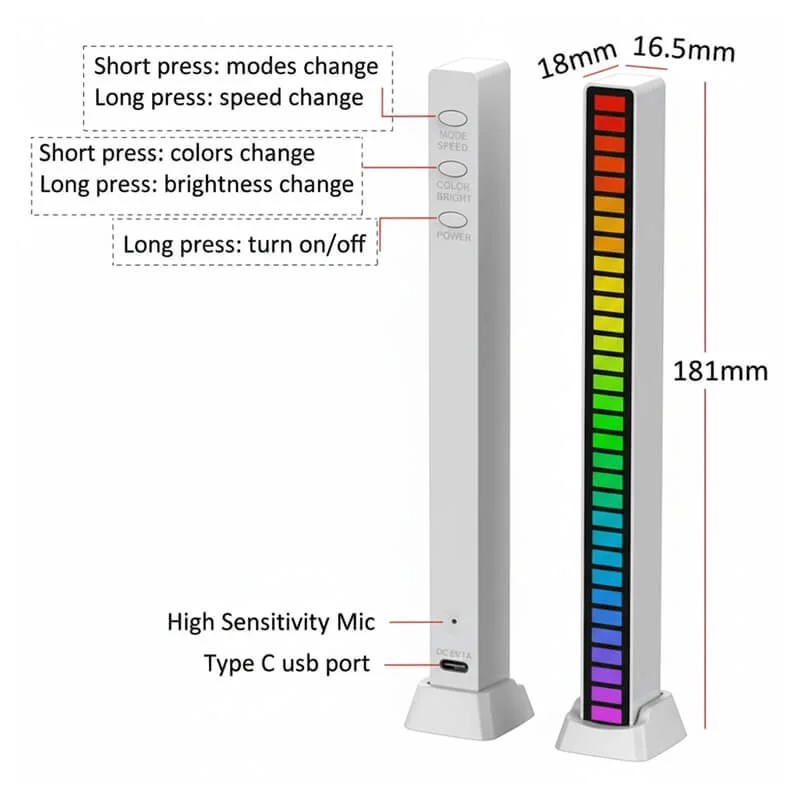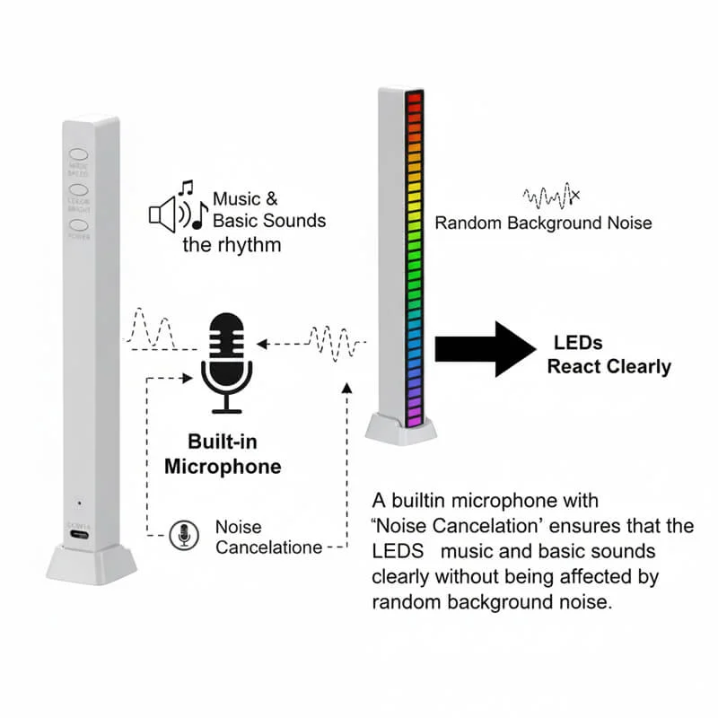 - تفاعل لحظي مع الإيقاع: ميكروفون مدمج بخاصية "إلغاء الضوضاء" (Noise Cancellation) يضمن تفاعل الليدات مع الموسيقى والأصوات الأساسية بوضوح دون التأثر بالضجيج العشوائي في الخلفية.