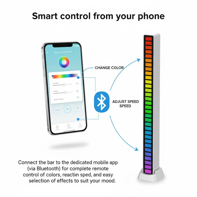 - تحكم ذكي من هاتفك: اربط البار بتطبيق الموبايل المخصص (عبر البلوتوث) للتحكم الكامل عن بعد في الألوان، وسرعة التفاعل، واختيار المؤثرات التي تناسب مزاجك بكل سهولة.